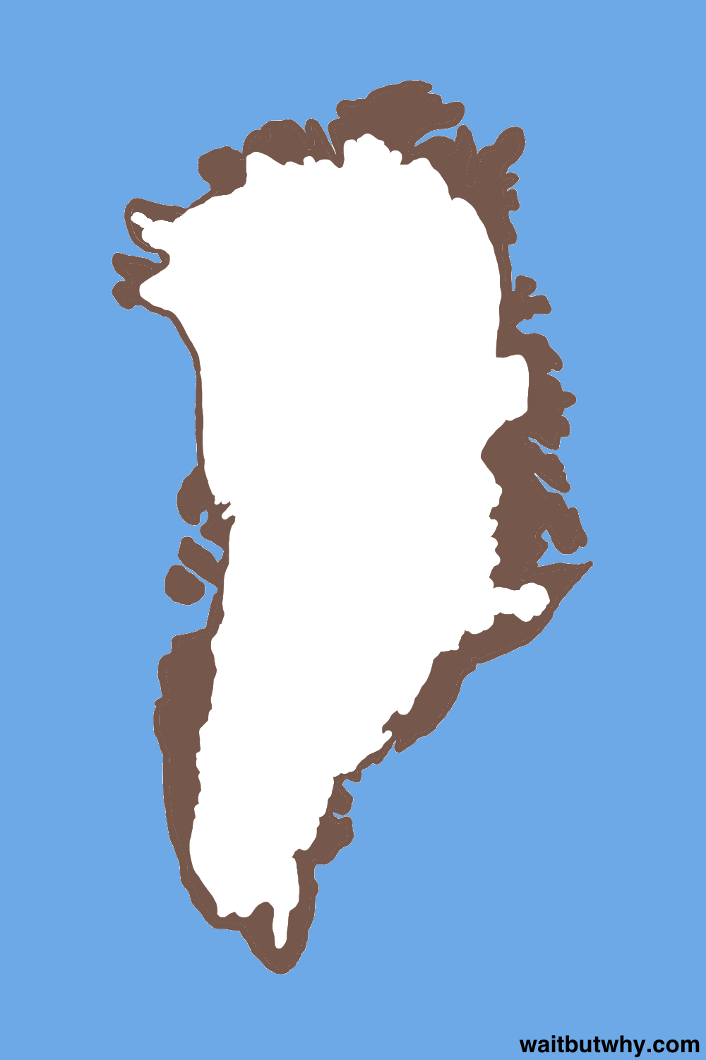 Back to Greenland. So as a result of that “more snow falling than melting” buildup phenomenon, Greenland now has what I enjoy calling a 2,565,000,000,000,000 tonne ice cube sitting on top of it. Some facts about this ice cube: