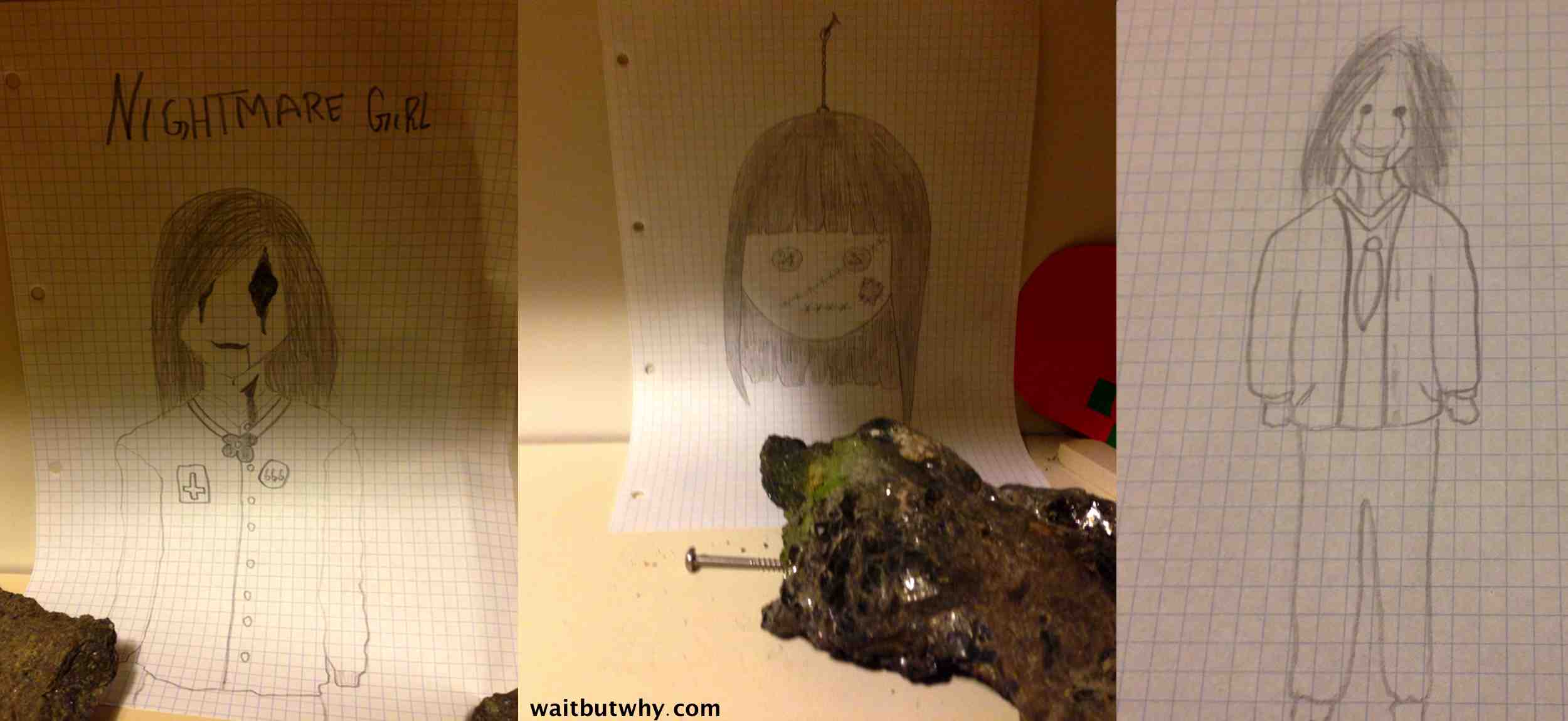 Nope. I don’t know what that means but nope. So I do a U-turn back inside and head into my bedroom, and I see a bunch of not at all cool drawings lying around on the shelves.