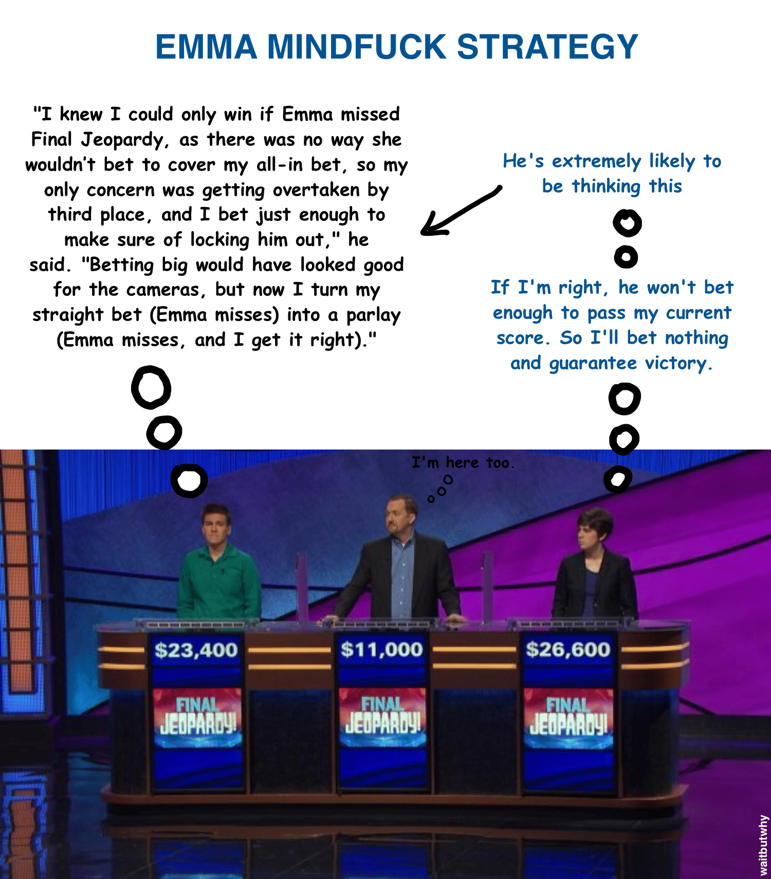 Let’s think about this for a second. If you’re Emma, you know James is an amazing strategist who has likely analyzed every possible Final Jeopardy scenario through and through. So you can guess that he will go through the above reasoning and will therefore make a bet small enough to win in the case that you both get the answer wrong. And if he does what you expect him to, given what he assumes you’re going to do, you now have an opportunity to steal both the blue [wrong-wrong] and the orange [I’m wrong – he’s right] quadrants back from him by betting less than the traditional reasoning would tell you to.