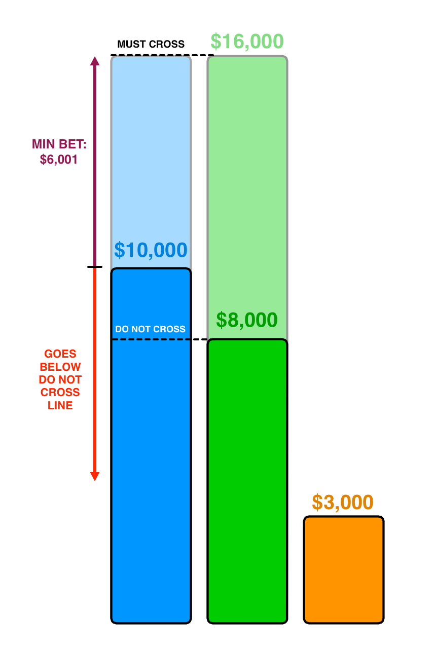 You’d also want to make sure you win in the case that you and second place both get it wrong. The worst-case scenario here is that second place gets it wrong but, for some odd reason, bets nothing. That makes their pre-round total ($6,000 in our example) your “do not cross under any circumstances” line. So your maximum bet would be $3,999.
