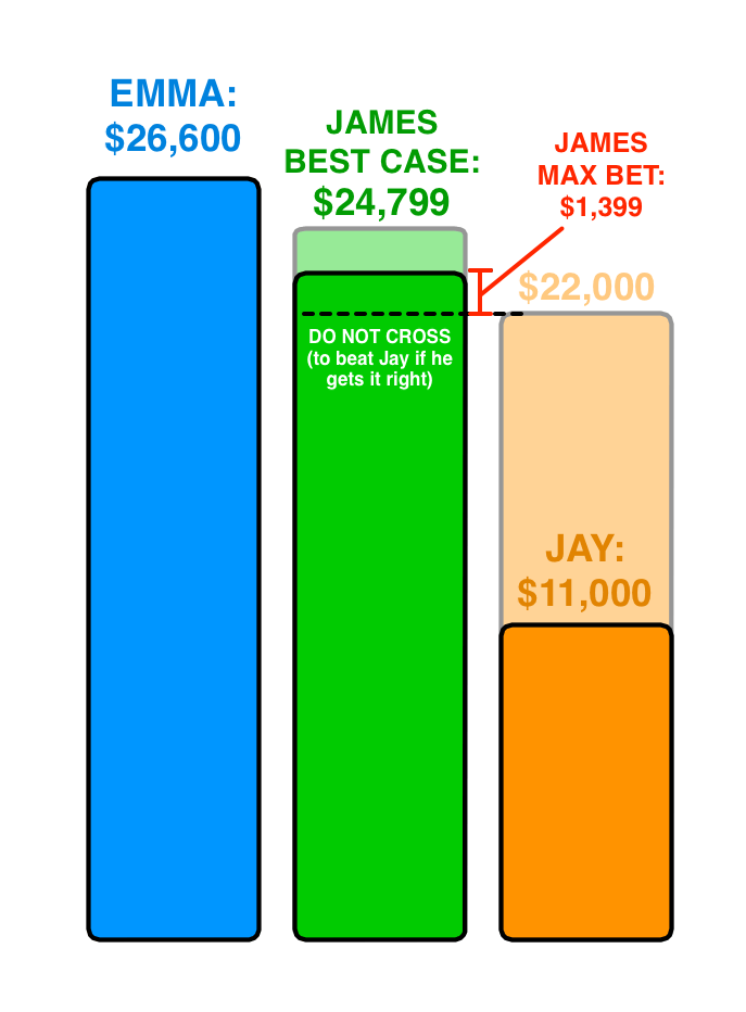 With that bet, he’d win if Emma got it wrong, and Jay would have no chance of beating him—in both cases, regardless of whether he got the answer right or wrong. Being in second place isn’t a great situation to be in, but James gave himself the best shot he could.
