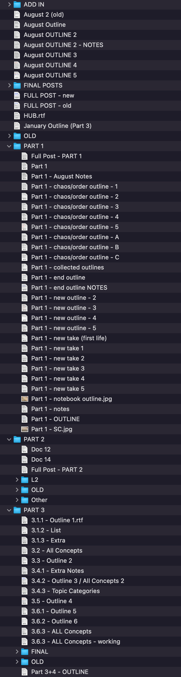 The problem is that the outlines became ridiculous. I couldn’t keep it all in my head at once, so I made sub-outlines, and sub-sub-outlines. The Society folder now looked like this: