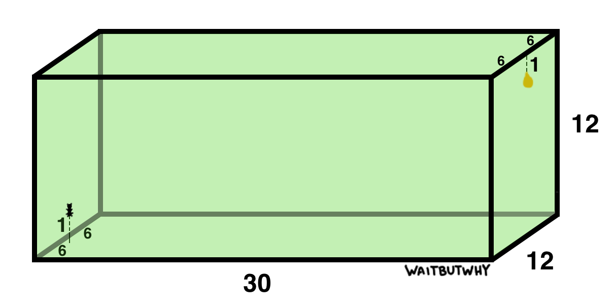 An ant is inside the box, 1 cm from the bottom, and wants to go eat the drop of honey on the opposite side, 1 cm from the top. Both the ant and the honey are exactly 6 cm from the walls. Crawling on inside of the box, what’s the shortest distance the ant can crawl to get to the honey?